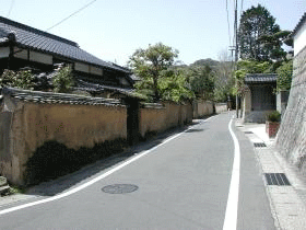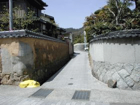 | さらに西に行くと右折して惣社町にはいる。これからは山側に入ります。少し上ったところの右側に長府毛利邸があります。坂を登って門を入ると広場があります。その奥に屋敷がありますが、石垣や漆喰の塀壁は良いものです。 長府毛利邸 (立札より転載) 長府毛利邸は、長府毛利家十四代当主の毛利元敏公が、東京から帰住するため、この地を選んで建てた邸宅で、明治31年(1898)に起工し、明治36年6月2日に完成した後、大正八年(1919)まで長府毛利家の本邸として使用されました。 その間、明治35年11月には、明治天皇が、熊本で行われた陸軍大演習を御視察の際、当邸を行在所として使用され、、一部の部屋は当時のまま残されていて、往時を偲ばせてくれます。 また津軽家に嫁がれた、常陸宮華子妃殿下の御生母となられた久子様(元敏公のお孫さんにあたる)も、このお屋敷で幼少時代を過ごされています。邸内にある庭園は、池泉回遊式で苔・石・池・楓・灯篭等の配置の妙は、新緑や紅葉の季節に一段と映え、しっとりとした日本庭園の佇まいを感じさせてくれます。 川端町のにも土壁の塀が残っており、長府らしい道です。さらに街道を西に進みます。 |